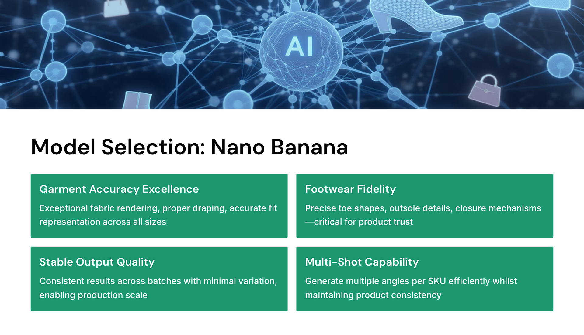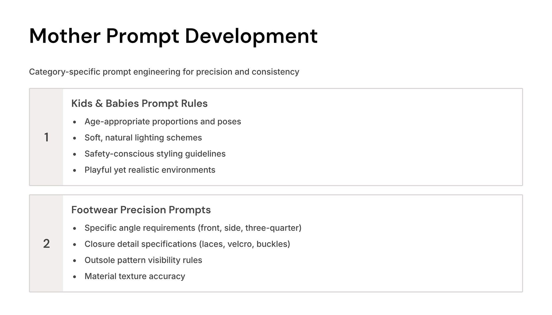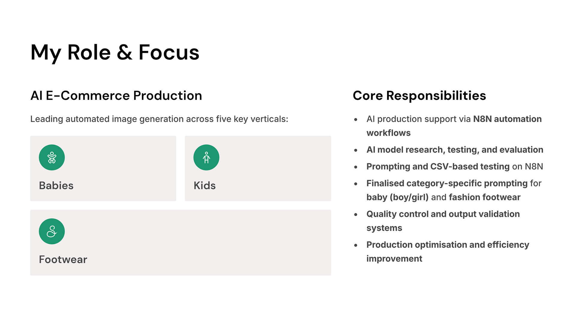 As part of the in-house AI production team, I contributed to developing large-scale e-commerce imagery for brands like Babyshop kids & baby fashion and Shoemart footwear. My role covered the full creative-technical cycle — from research, prompt creation, and input–output testing to image generation and final prompt optimization for the N8N automated workflow. I conducted extensive input–output testing across multiple AI models — evaluating garment accuracy, lighting consistency, pose realism, and brand styling to refine production logic and achieve uniform visual quality. Explored and implemented multi-model testing using OpenAI, Flux, Nano Banana, and Kling, integrating consistent output logic for product accuracy and visual fidelity. Prompt development and refinement were executed through advanced conversational workflows with ChatGPT and Claude, ensuring seamless, high-quality results across both image and video generation pipelines.